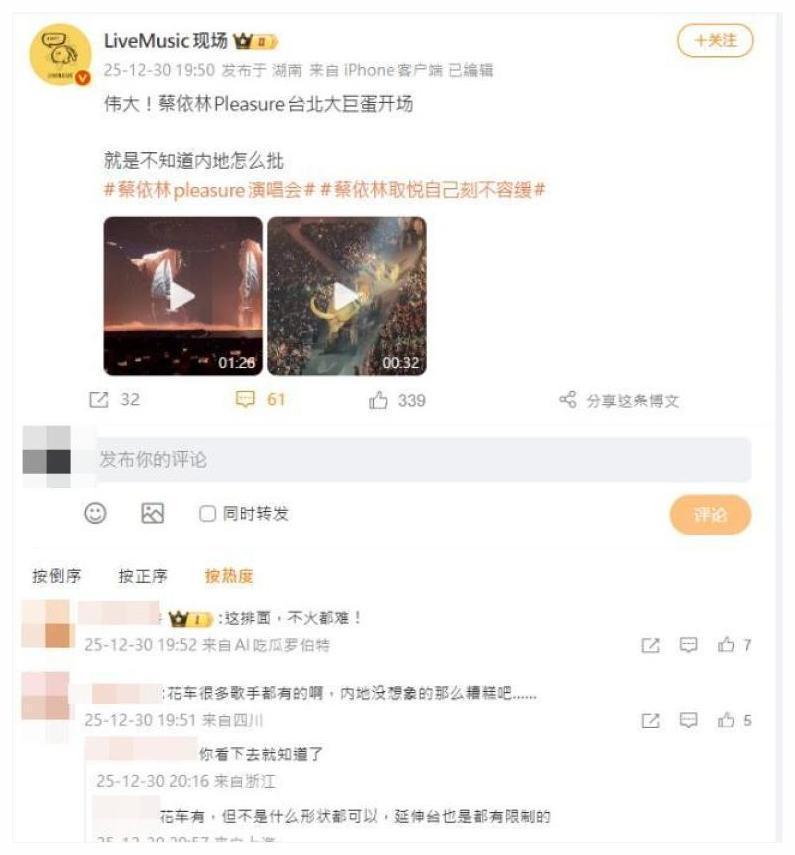 首场结束 台湾媒体跪舔:“史上最狂开场!巨蟒绕场解锁大巨蛋成就!”(噓!星闻)。视频上传B站微博,播放量破百万,大陆网友炸锅:“道具逆天 成神作没跑了!”(Bilibili弹幕)。